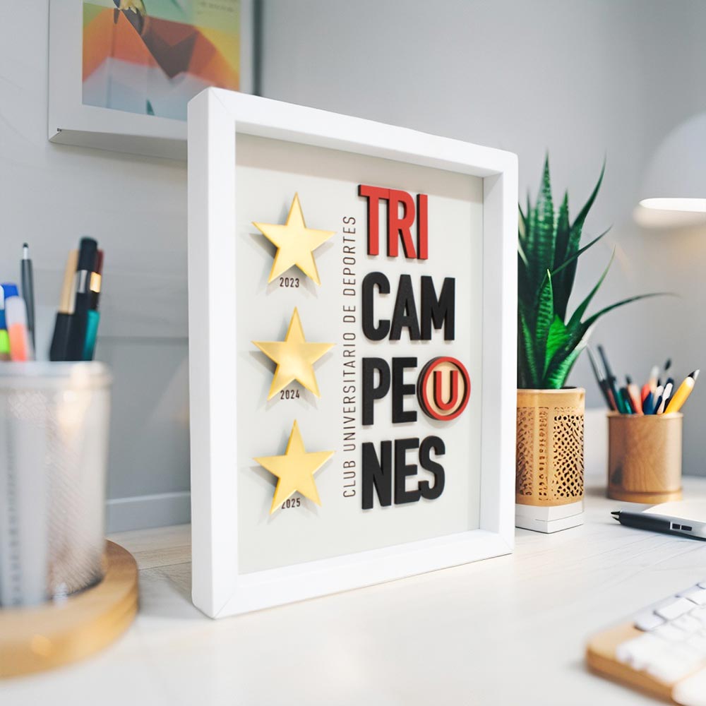 Celebra la gloria de Universitario con este espectacular cuadro 3D en blanco que captura los tres campeonatos que definen la historia del club.