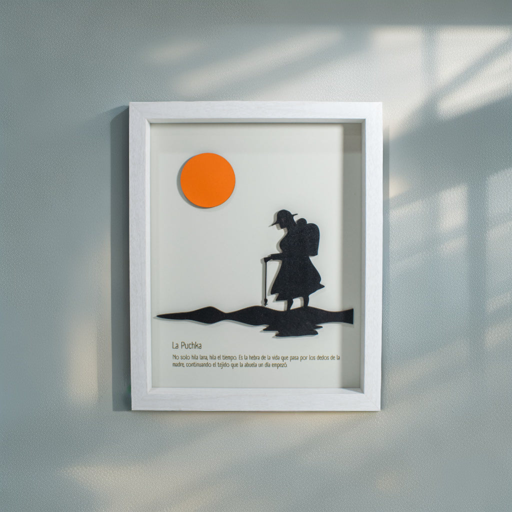 Homenaje a la tradición andina. Este cuadro "La Puchka" es una pieza de arte minimalista con figuras en relieve 3D. Un diseño conmovedor fabricado con tecnología de corte láser.