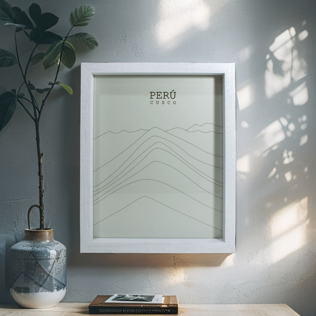La elegancia de los Andes. Este cuadro captura las montañas de Cusco, Perú, con un diseño de líneas finas. Creado con corte láser para lograr un sutil y sofisticado relieve 3D.