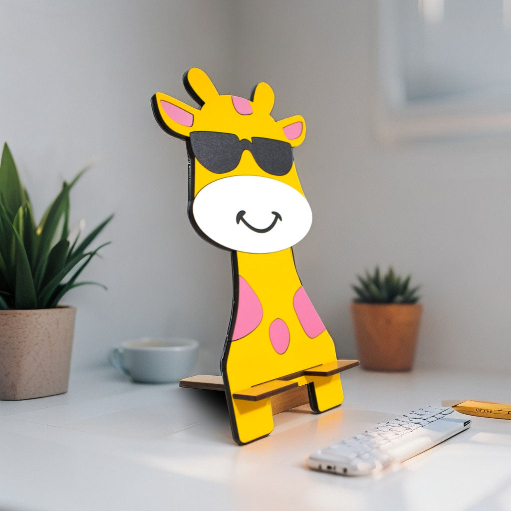 Deja que tu jirafa favorita cuide de tu celular. Este adorable soporte de madera MDF presenta a una jirafa naranja con lentes que mantiene tu dispositivo seguro y visible.