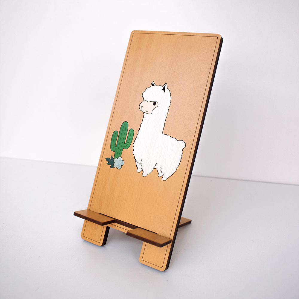 Soporte para Celular en MDF con figura de Alpaca fondo madera Haya